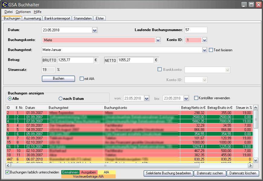 The GSA Buchhalter is a software for all self-employed persons and small companies who do not need a double entry bookkeeping. The program is easy to use and is not overloaded with unnecessary functions. The application can manage unlimited entries of your customers and their in- and outcomes. The booking accounts are freely configurable and each of them can be changed at every time. You get an immediate overview of all bookings in a graphical diagram. The time period in this overview is changeable to monthly, yearly or to a free date. Moreover the accountant program contains an income surplus calculator and a monthly value added tax report. You have tax reports included for the tax office (sales tax report and statement on excess of receipts over expenses). For your safety we have included the possibility to quickly make backups of the database and of course the ability to write it back in case of an emergency.