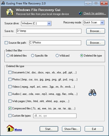 If you can't locate a lost file from your backup, then you can use Eusing Free File Recovery. The Windows Team has quietly rolled out a file recovery tool in the Microsoft Store, which can be used to recover deleted files from your Windows 10 or 11 computer. You may not have heard of it unless you are familiar with the command-line tool, or CMD. It's Windows File Recovery, which is a command line app available from the Microsoft Store. Use this app to try to recover lost files that have been deleted from your local storage device (including internal drives, external drives, and USB devices) and can’t be restored from the Recycle Bin. But many people are not familiar with using command line mode, and Eusing Free File Recovery provides a user interface. It adds a graphical user interface (GUI) to Microsoft Windows File Recovery, making it more accessible to anyone who does not like the command prompt. Launch the software and wait for it to identify your drives. Select the drive you wish to examine and a folder to save any recovered files. You will need a second hard drive or even a thumb drive as you can't and shouldn't save recovered files to the drive being scanned. The source and destination drives must be different. The software will automatically create a recovery folder for you called, Recovery_'date and time' on the destination drive. There are two scanning modes: Quick Scan and Deep Scan. At the beginning, you can use Quick Scan. If you really cannot find the file you want, you can change to Deep Scan. Of course, its cost is that it will consume more recovery time. You also can scan for a specific file by using a file name, file path, file type, or wildcards. Let this software be your choice for helping to find what you need from your hard drive, SSD (*limited by TRIM), USB drive, or memory cards.