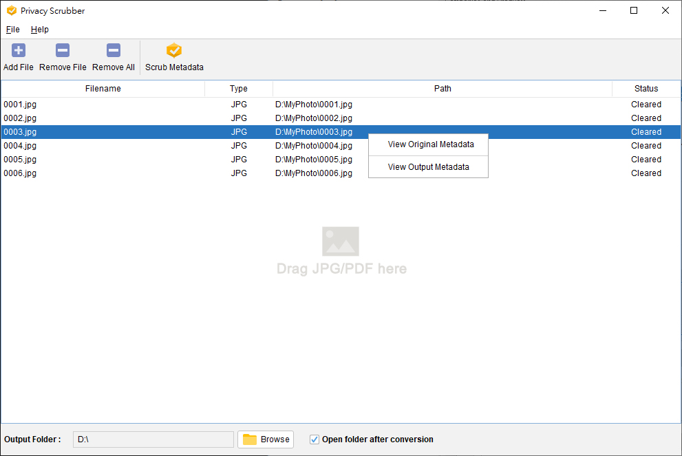 Built-In Metadata Verification: Trust, but verify. Right-click any file in the queue to "View Original Metadata" and see exactly what hidden data you are currently leaking. After processing, right-click again to "Verify Cleaned Metadata" and confirm the file is completely sanitized.
